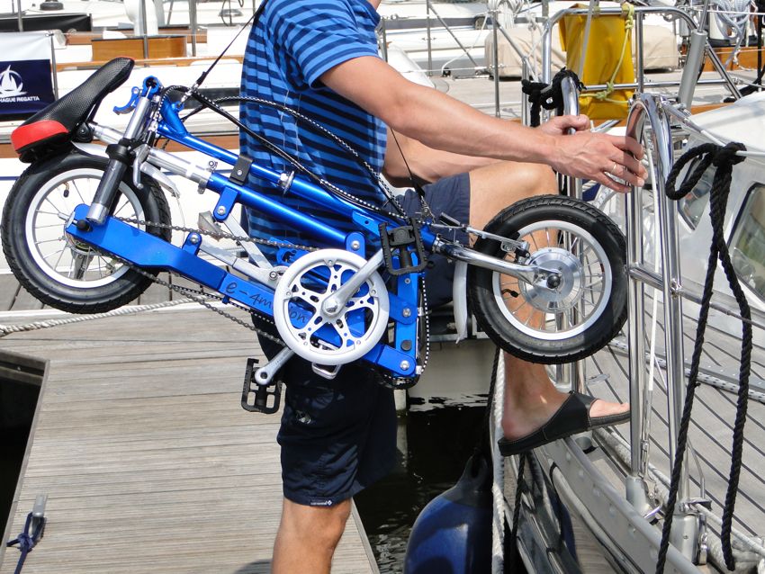 Das elektrische Faltrad Typ MINI von e-4motion ist ein leistungsstarker Helfer für Ihren Komfort. Warum ist der MINI so ein ideales Motorrad zum Bootfahren? Der MINI lässt sich sehr kompakt zusammenfalten und kann so in der Schaufelkiste verstaut werden. Außerdem ist das MINI als elektrisches Faltrad durch sein einzigartig geringes Gewicht sehr handlich. Und natürlich ist der MINI in hochwertigem Aluminium mit einer sehr edlen Oxid-Farbbeschichtung ausgeführt. Mit anderen Worten: ein guter Schutz gegen Rost. Alles in allem, nicht umsonst ein ideales nautisches Fahrrad!